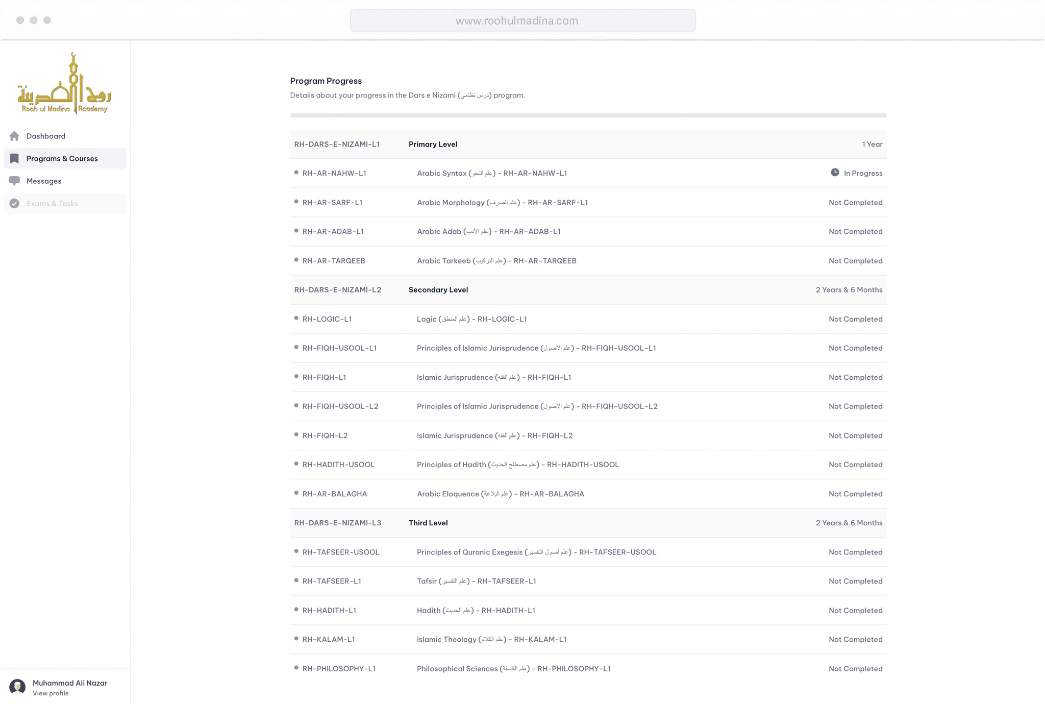 Rooh ul Madina academy provides courses and programs that are taught in-person or online (either one-on-one or joint classes), and also as self-paced online courses.